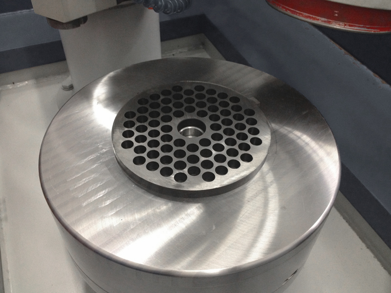 Centering system for grids and flat plate mincer blades on rotating magnetic chuck.