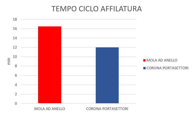 Grazie al taglio “interrotto” garantito dalla corona portasettori, per sua natura più aggressivo rispetto al taglio “continuo” o “costante” garantito invece dall’anello, possiamo permetterci di utilizzare parametri di lavoro del ciclo più spinti con conseguenti benefici in termini di velocità di esecuzione del ciclo di asportazione a vantaggio dei settori. Possiamo affermare che il ciclo di lavoro utilizzando i settori può essere fino a 1/3 inferiore come durata, a parità di volume di materiale asportato.